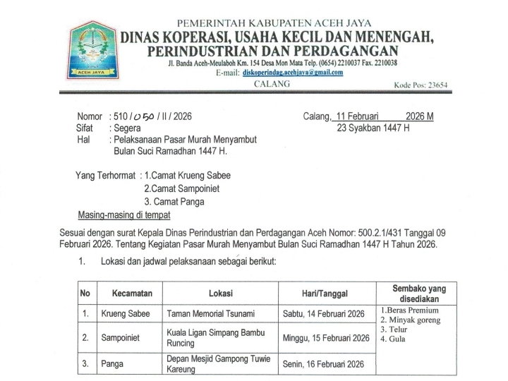 TAGACEH – Dinas Perindustrian dan Perdagangan Provinsi Aceh bekerjasama dengan Pemkab Aceh Jaya akan menggelar kegiatan Pasar Murah dalam rangka menyambut Bulan Suci Ramadhan 1447 Hijriah.