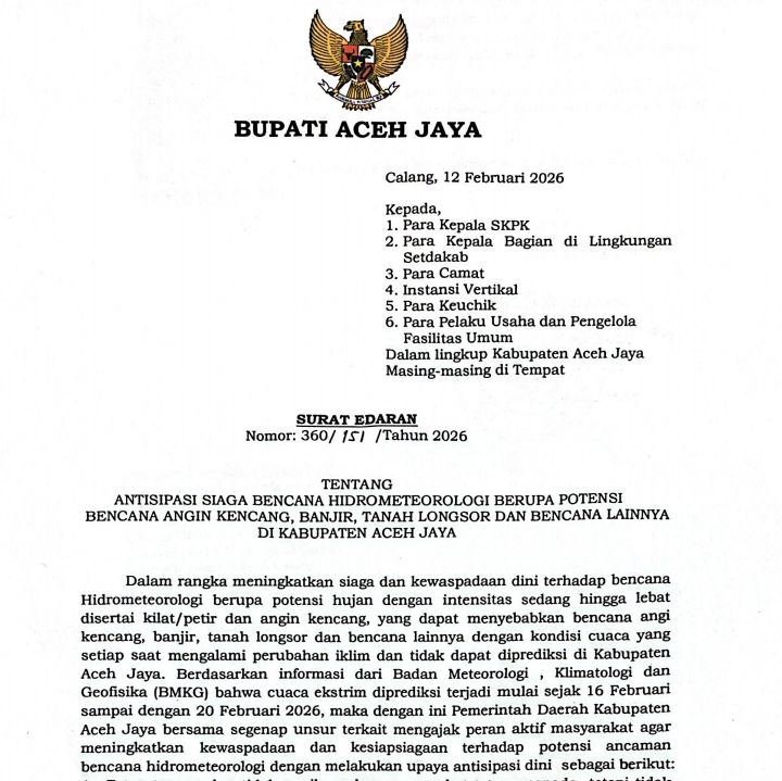 Hal itu tertuang dalam Surat Edaran Bupati Aceh Jaya Nomor: 360/151/Tahun 2026 tentang Antisipasi Siaga Bencana Hidrometeorologi berupa potensi angin kencang, banjir, tanah longsor dan bencana lainnya di wilayah Kabupaten Aceh Jaya.